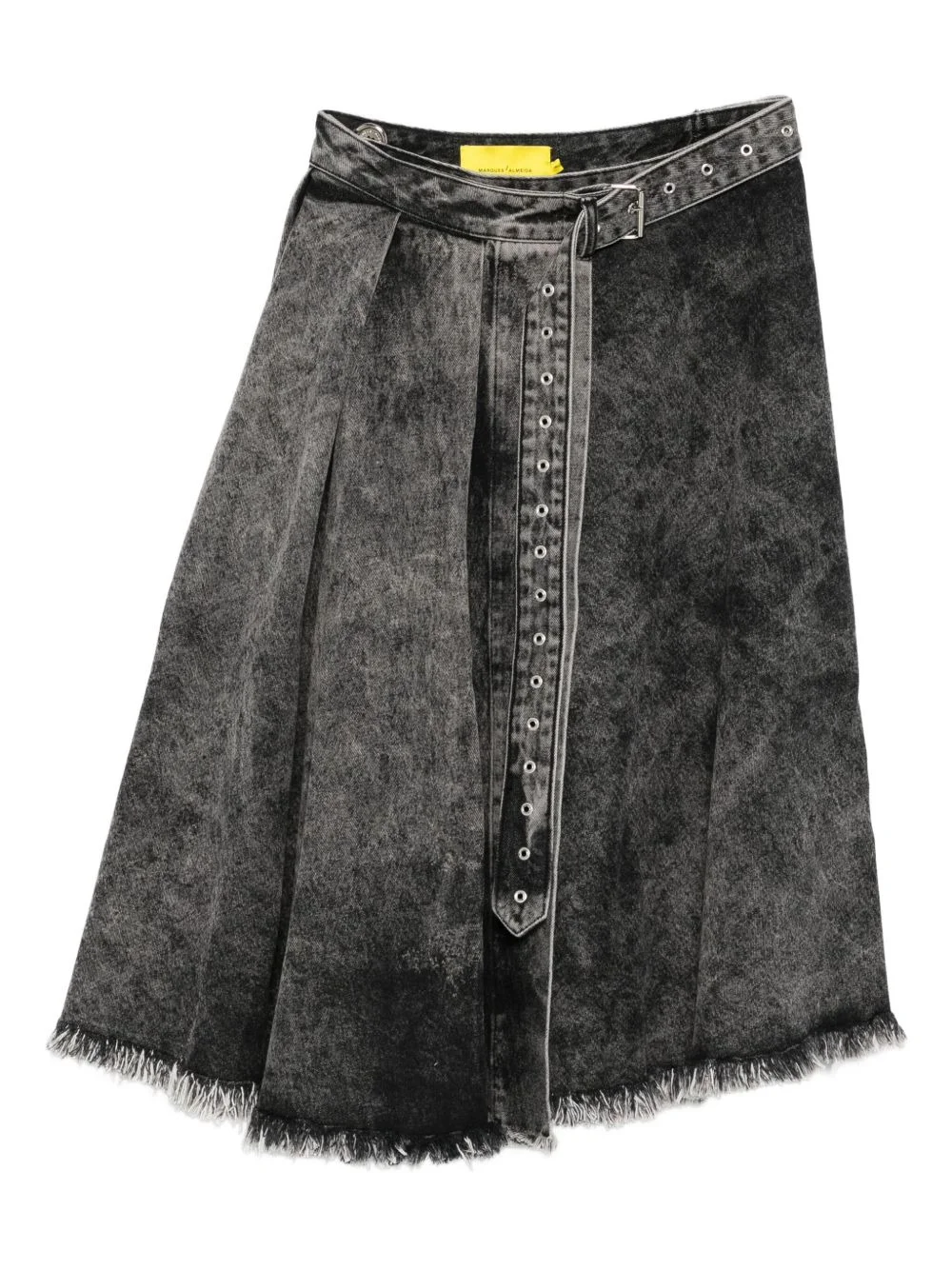 belted denim skirt Highlights - Black - Detachable and adjustable waist belt - Fringed edge Imported Composition Organic Cotton 100% SIZE & FIT Model measurements Height 5 ft 10 in(1.78 m) Bust/Chest 33.46 in(85 cm) Hips 36.22 in(92 cm) Waist 23.22 in(59 cm) Washing instructions Machine Wash