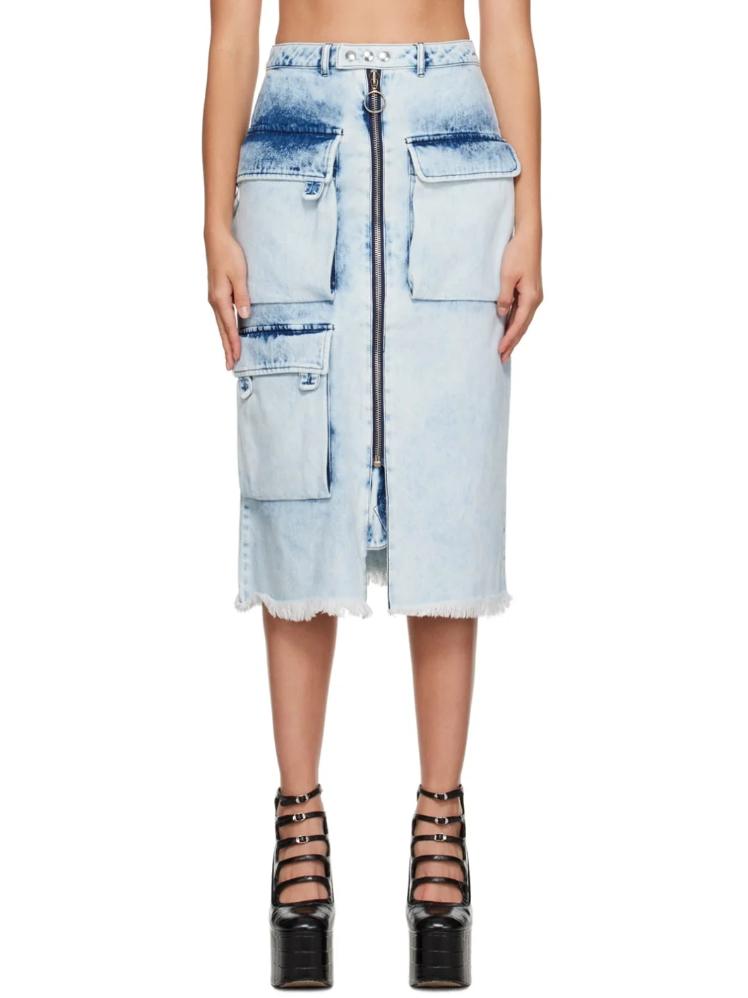 Non-stretch REFIBRA™ recycled and organic cotton-blend denim skirt. Bleach effect throughout. · Belt loops · Flap pockets at front · Press-stud tab at zip-fly · Fraying at hem Supplier color: Acid wash 83% recycled cotton, 17% organic cotton. Made in Portugal 232714F092000