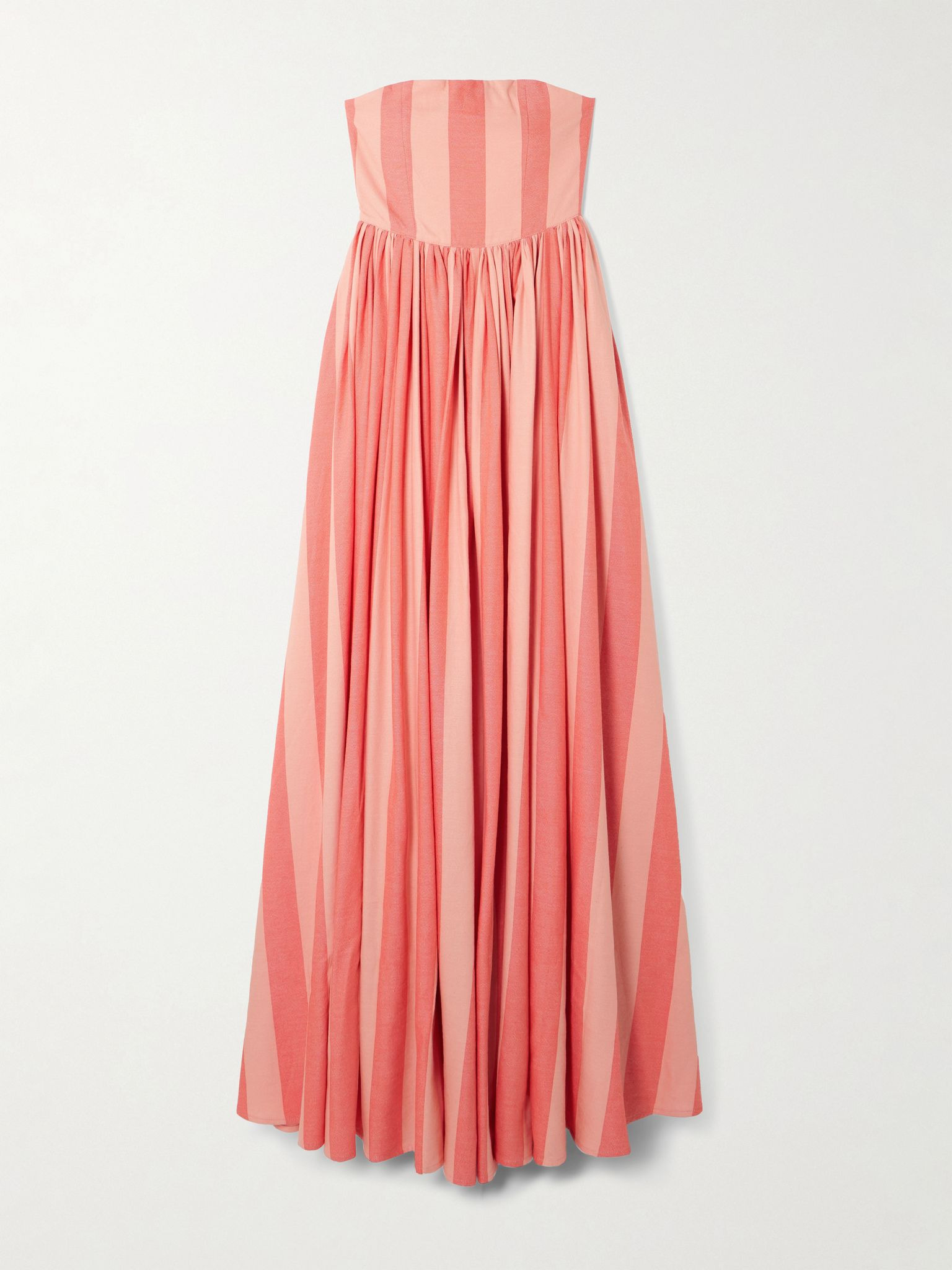From start to finish, Marrakshi Life's dress has been handmade in Marrakech - the striped cotton is created in-house using traditional Moroccan hand-worked looms. The strapless design falls to a full pleated skirt that skims the floor, so it's perfect for making sweeping entrances - or exits. Keep your accessories simple. Size & Fit - Fits true to size, take your normal size - Designed to be slightly fitted at the bust and waist, loose at the hip - Mid-weight, non-stretchy fabric - Model is 180cm/ 5'11" and is wearing a size Small Model measurements: - Bust: 80cm/ 31.5" - Waist: 65cm/ 25.5" - Hip: 89cm/ 35" Details & Care - Tonal-pink cotton - Zip fastening along back - 100% cotton - Unlined - Dry clean