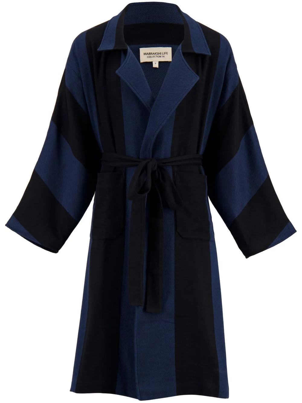 striped cotton coat Highlights - Black/navy blue - Cotton - Twill weave - Vertical stripe pattern - Notched lapels - Concealed front fastening - Long sleeves - Belted waist - Two side patch pockets - Mid-length - Straight hem Imported Composition Cotton 100% Washing instructions Dry Clean Only