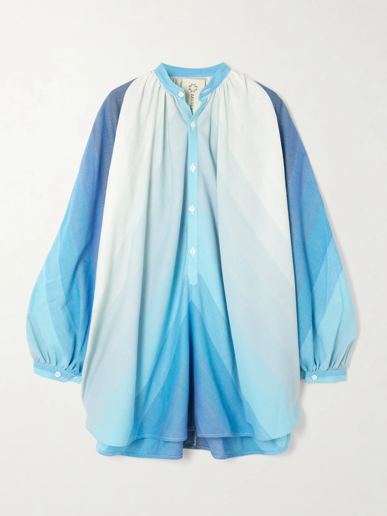 Rendered in a vibrant tonal-blue degrade; Marrakshi Life's 'Touareg' shirt dress is handwoven in Marrakesh on traditional flatbed looms. It's made from striped cotton and falls to an airy, oversized silhouette, refined by a gathered neckline and blouson sleeves. Responsible Craftsmanship. This product promotes artisanal skills and a brand that invests in communities and adheres to fair-trade principles. Find out more about our NET SUSTAIN criteria here.