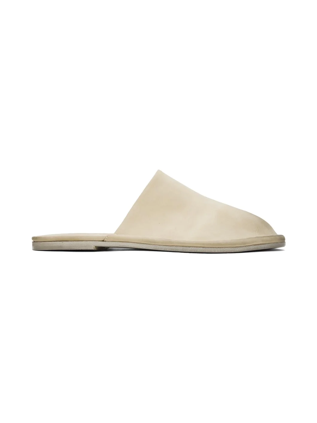 Nubuck slippers in beige. · Logo embossed at padded footbed · Grained leather lining · Topstitching at welt · Leather block heel with rubber injection · Hand-painted leather sole Supplier color: Arenite Upper: leather. Sole: leather, rubber. Made in Italy 241349F124023