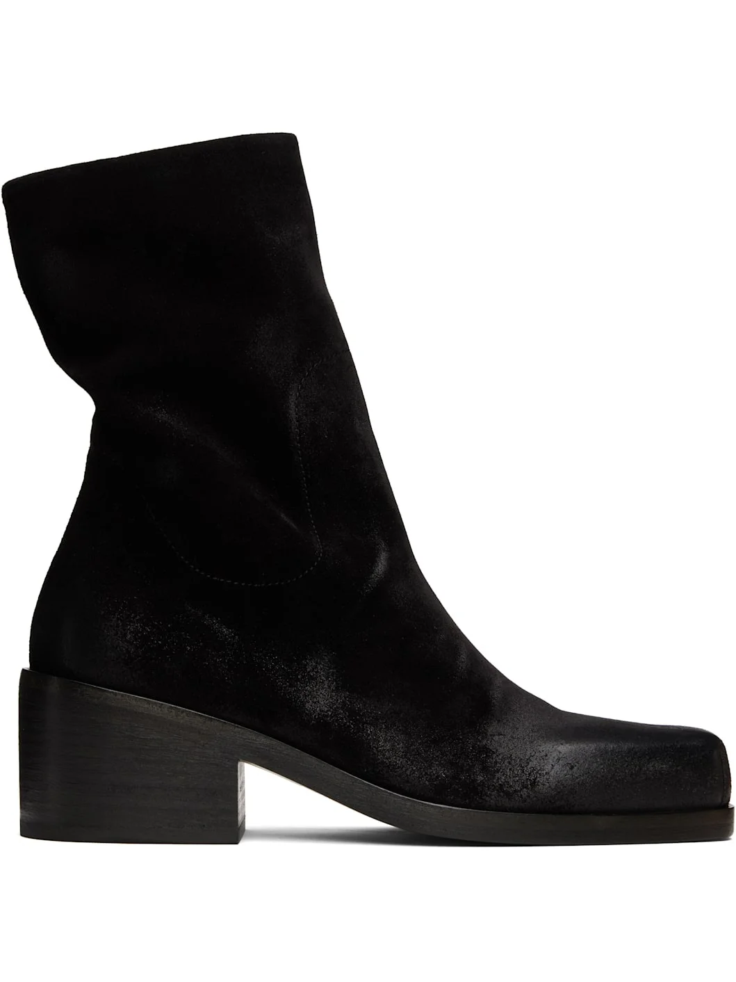 Ankle-high suede boots in black. · Square toe · Zip closure at inner side · Stacked leather block heel with rubber injection · Leather sole · Heel: H2.25" Supplier color: Black Upper: leather. Sole: leather, rubber. Made in Italy 252349F113004