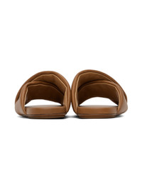 Handcrafted padded buffed leather slip-on sandals in brown. · Open round toe · Logo embossed at footbed · Rubber injection at leather sole Supplier color: Walnut Leather. Made in Italy 241349F124010