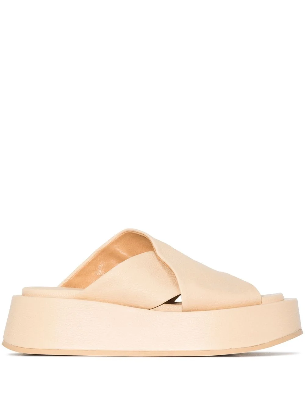 crossover-strap platform sandals Marsell showcases its penchant for bold looks with these sandals. Made from beige grained leather, they're set atop an unmissable platform sole. Highlights - Beige - Open toe - Grained texture - Crossover strap detail - Branded insole - Slip-on style - Platform sole Made In Italy Composition Leather 100% SIZE & FIT Model measurements Height 5 ft 9 in(1.76 m) Bust/Chest 33.46 in(85 cm) Hips 37.79 in(96 cm) Waist 25.59 in(65 cm) Measurement HEEL 2.55 in(6.5 cm) PLATFORM 1.77 in(4.5 cm) FittingInformation This piece fits large – take one size down