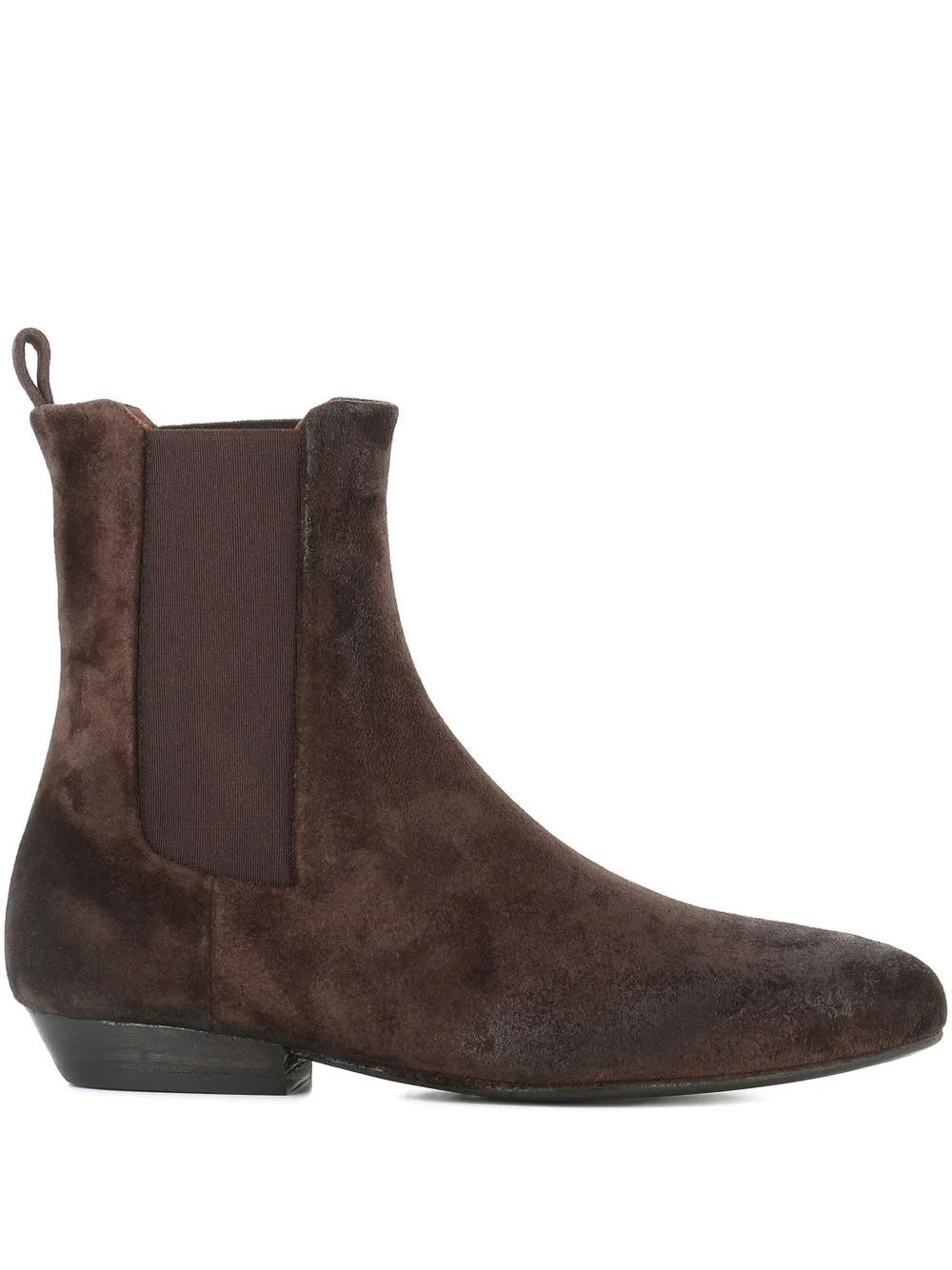 elastic-panel suede boots Highlights - Brown - Suede - Elastic side panels - Almond toe - Flat sole - Rear pull-tab Made in Italy Composition Outer: Suede 100% Sole: Calf Leather 100% Lining: Calf Leather 100%