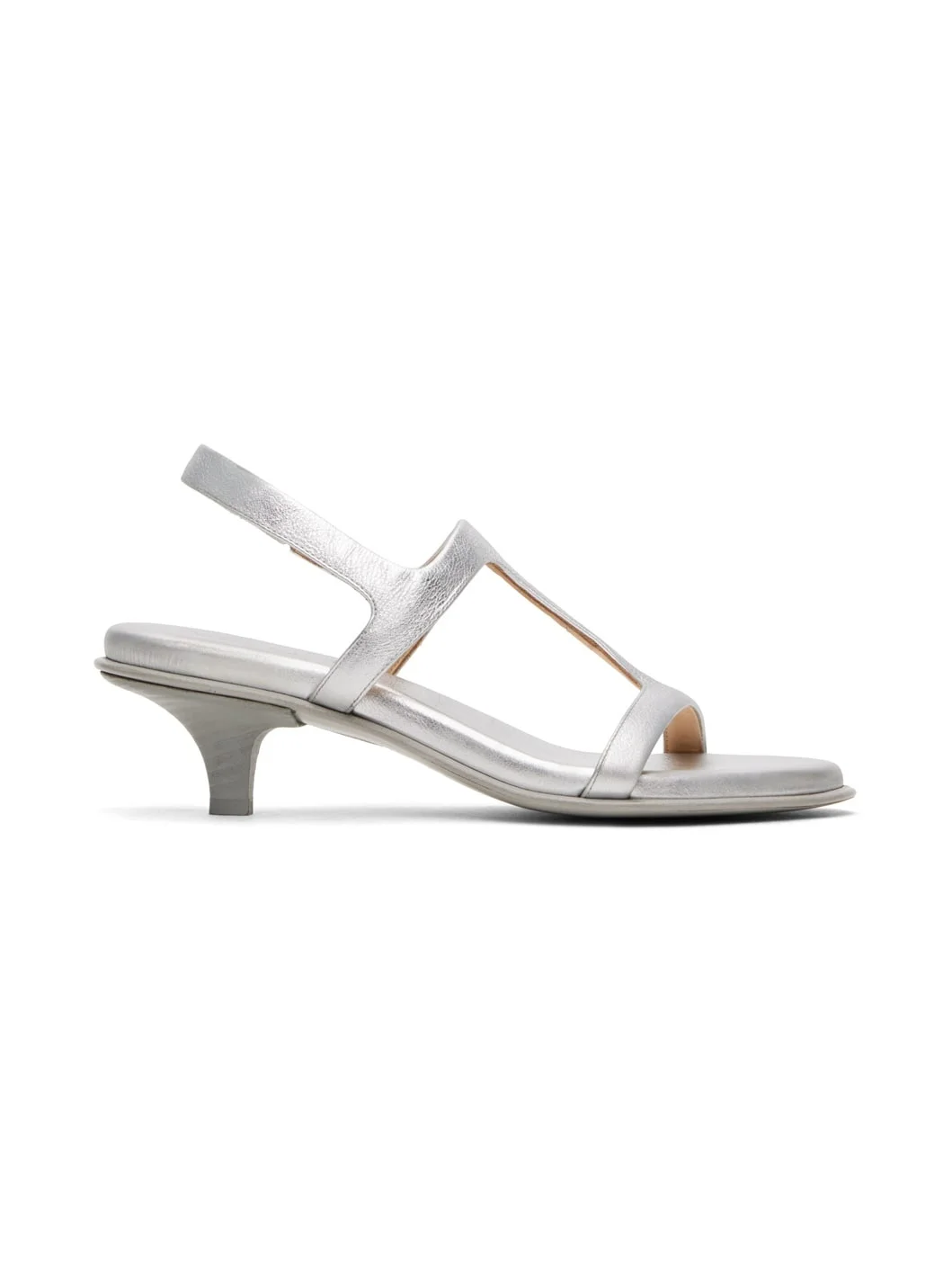 Grained calfskin heeled sandals in silver tone. · Open toe · Elasticized slingback strap · Logo-embossed grained leather footbed · Leather kitten heel with rubber injection · Suede sole · Heel: H2" Supplier color: Silver foil Upper: calfskin. Sole: leather, rubber. Made in Italy 241349F125006