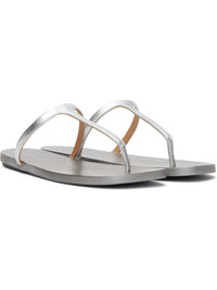 Laminated grained leather slip-on flat sandals in metallic silver tone. · Open toe · Thong-style strap at vamp · Logo embossed at leather footbed · Buffed leather lining · Hand-painted leather sole with rubber injection Supplier color: Silver foil Upper: leather. Sole: leather, rubber. Made in Italy 251349F124000