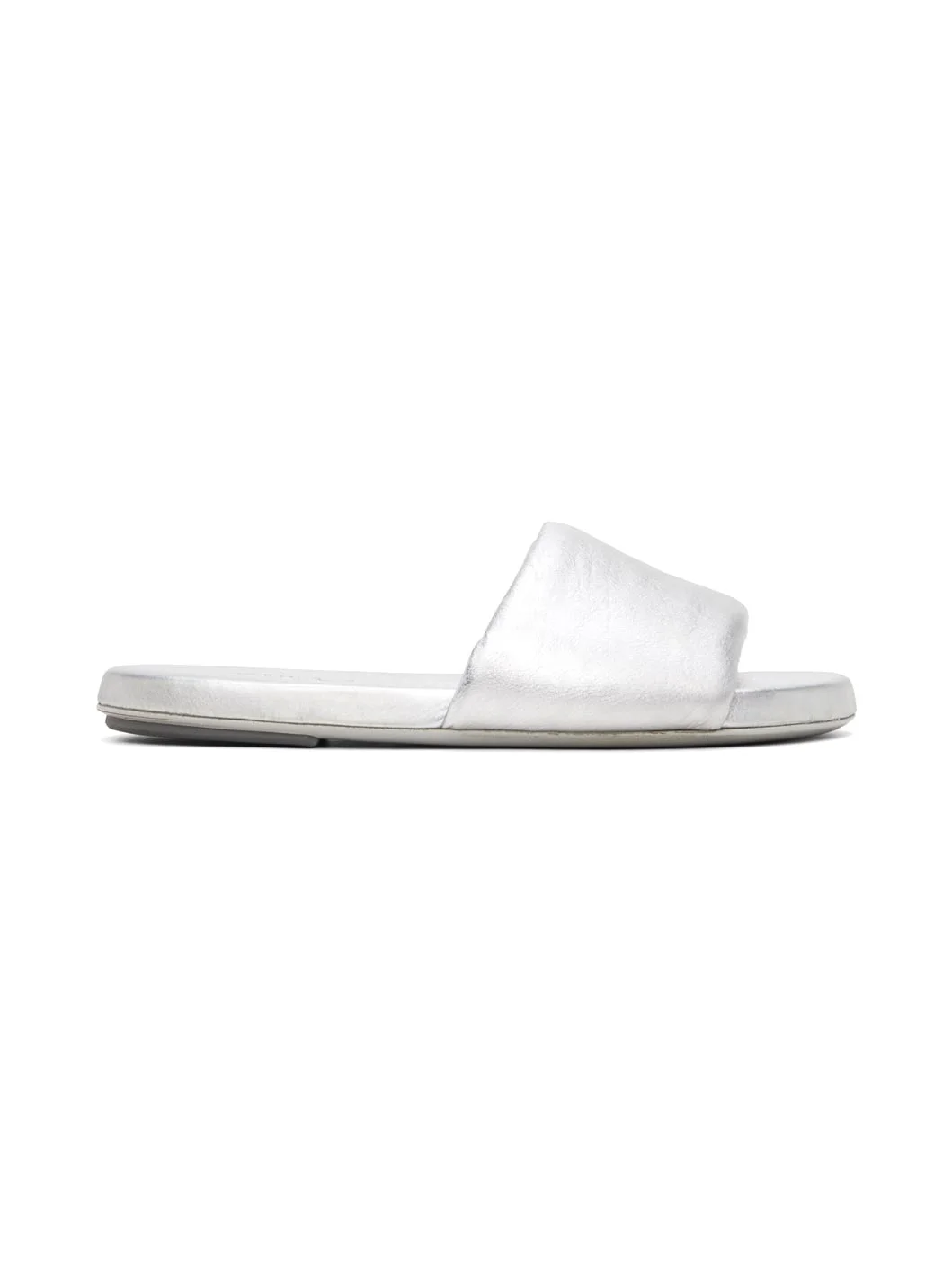 Handcrafted laminated grained leather slip-on flat sandals in silver tone. · Padded strap at vamp · Logo embossed at padded footbed · Grained leather lining · Hand-dyed leather sole with rubber injection Supplier color: Silver foil Upper: leather. Sole: leather, rubber. Made in Italy 241349F124024