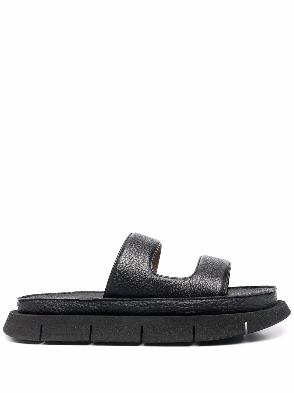 slip-on leather sandals black leather double-strap design round toe open toe slip-on style ridged rubber sole Made in Italy Composition Leather 100% SIZE & FIT Measurement HEEL 1.37 in(3.5 cm) Sole height 1.18 in(3 cm)