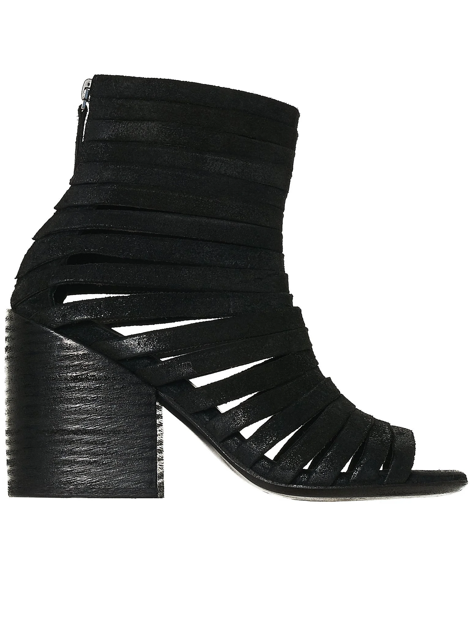 Marsell zipped leather heels in black, perforated leather strip vamping construction, stacked heels, tonal stitching. Made in Italy. Composition - 100% Leather EU Sizing.