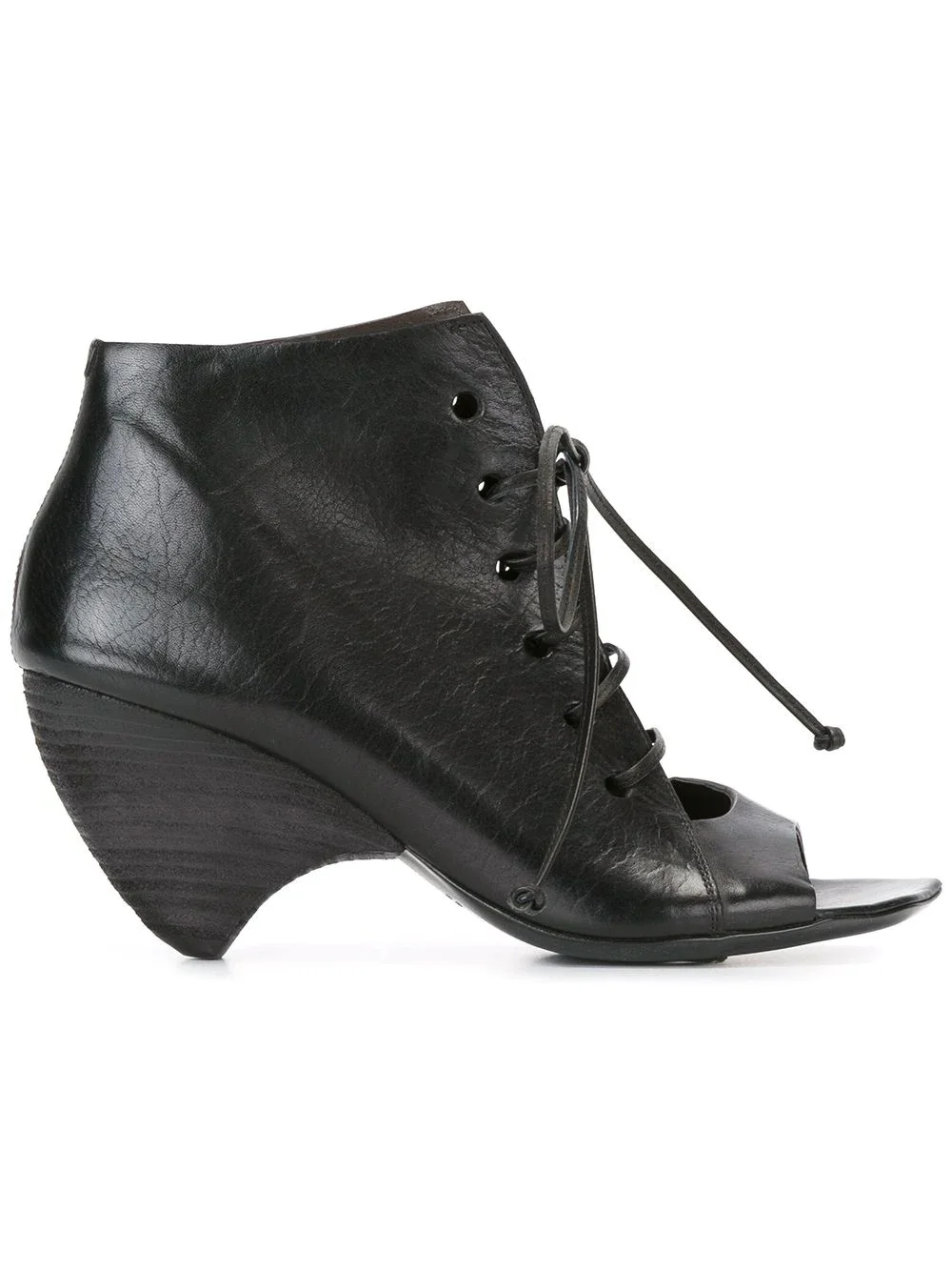 structured lace-up ankle boots Black leather structured lace-up ankle boots from Marsell featuring a structured design, an open toe, a lace-up front fastening and a structured mid-heel. Made in Italy Composition Outer: Calf Leather 100% Lining: Calf Leather 100% Sole: Calf Leather 100% SIZE & FIT Measurement HEIGHT 3.34 in(8.5 cm) HEEL 3.34 in(8.5 cm)