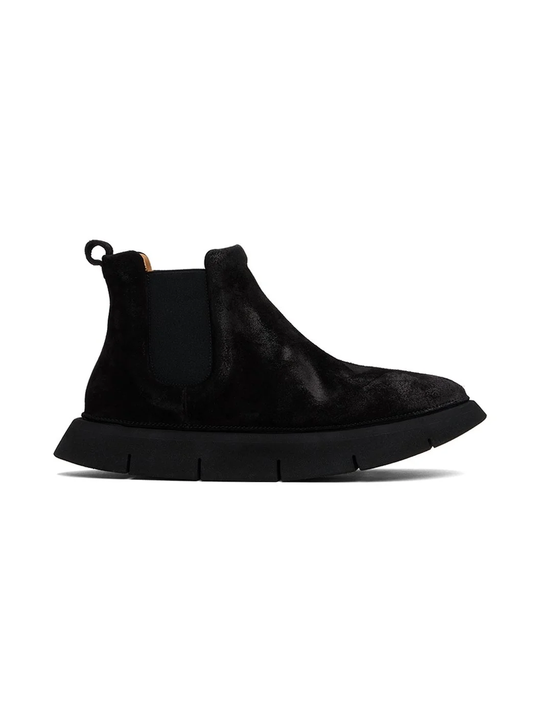 Ankle-high suede boots in black. · Distressing throughout · Padded collar · Pull-loop at heel collar · Elasticized gusset at sides · Grained leather lining · Treaded foam rubber platform sole · Platform: H1.5" Supplier color: Black Upper: leather. Sole: rubber. Made in Italy 242349F113005