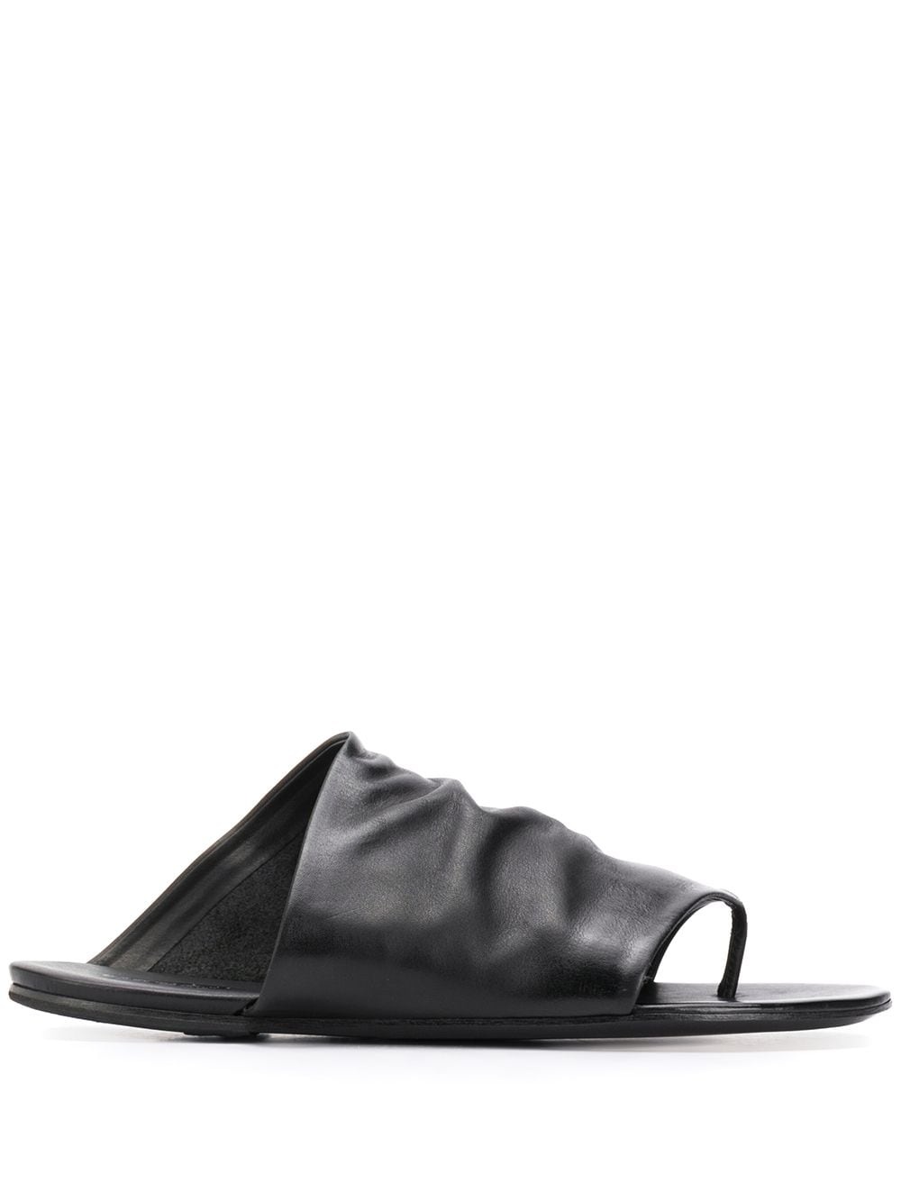 thong strap flat slides Black leather slides from Marsèll featuring an open toe, a thong strap, a brand embossed insole, a slip-on style and a flat sole. Made in Italy Composition Outer: Leather 100% Lining: Leather 100% Sole: Leather 100% SIZE & FIT Measurement HEEL 0.4 in(1 cm)