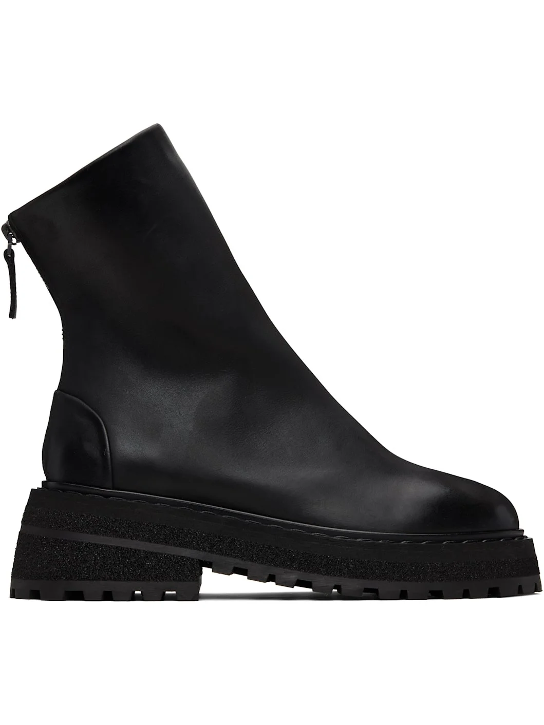 Ankle-high nubuck boots. · Zip closure at back · Buffed leather lining · Topstitching at welt · Stacked foam rubber platform midsole · Treaded rubber sole · Heel: H2.25" Supplier color: Black Upper: leather. Sole: rubber. Made in Italy 252349F113015