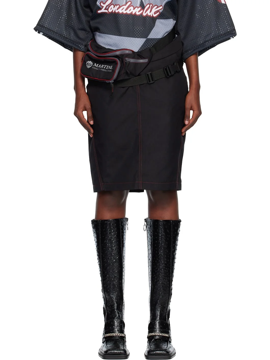 Nylon canvas miniskirt. · Integrated logo-printed zip pouch at waist · Adjustable press-release webbing straps at waist · Two pocket styling · Zip closure at side seam · Integrated zip pouch at back · Logo flag at back · Central vent at back hem · Full mesh lining · Contrast stitching in red Supplier color: Black/Red Body: 100% nylon. Lining: 100% polyester. Made in Romania 252892F090000