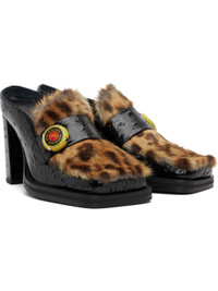 Crinkled calfskin and faux-fur slip-on heels. · Dot pattern embossed throughout · Square toe · Leopard pattern printed at vamp · Strap with logo hardware at vamp · Grained calfskin and suede lining · Block heel with rubber injection · Treaded rubber sole · Heel: H3.5" Supplier color: Black Upper: calfskin, synthetic. Sole: rubber. Made in Portugal 252892F122000