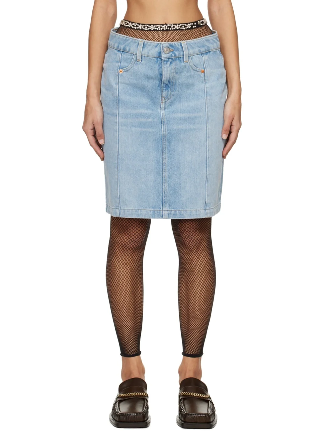 Non-stretch denim skirt. Fading and whiskering throughout. · Paneled construction · Belt loops · Four-pocket styling · Zip-fly · Logo patch at back pocket · Contrast stitching in yellow Supplier color: Bleached wash 100% cotton. Made in Italy 241892F090000