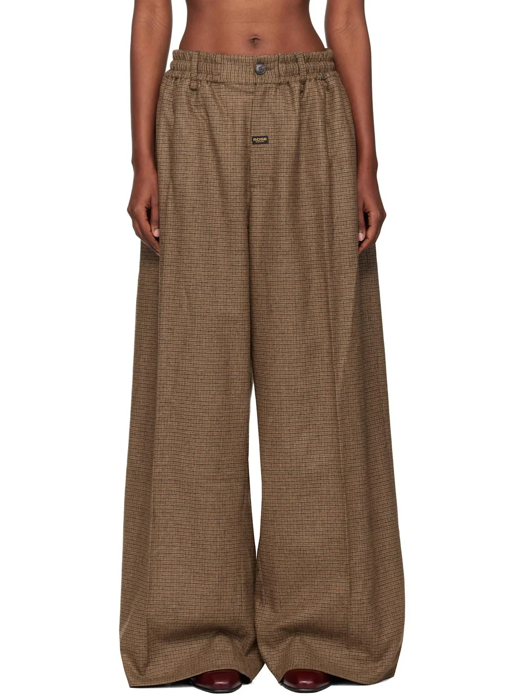 Stretch wool-blend flannel trousers. · Check pattern throughout · Concealed drawstring at elasticized waistband · Belt loops · Three-pocket styling · Zip fly · Logo patch at front · Creased legs Supplier color: Brown Body: 74% wool, 25% polyester, 1% elastane. Trim: 51% viscose, 49% cotton. Made in Bulgaria 252892F087001