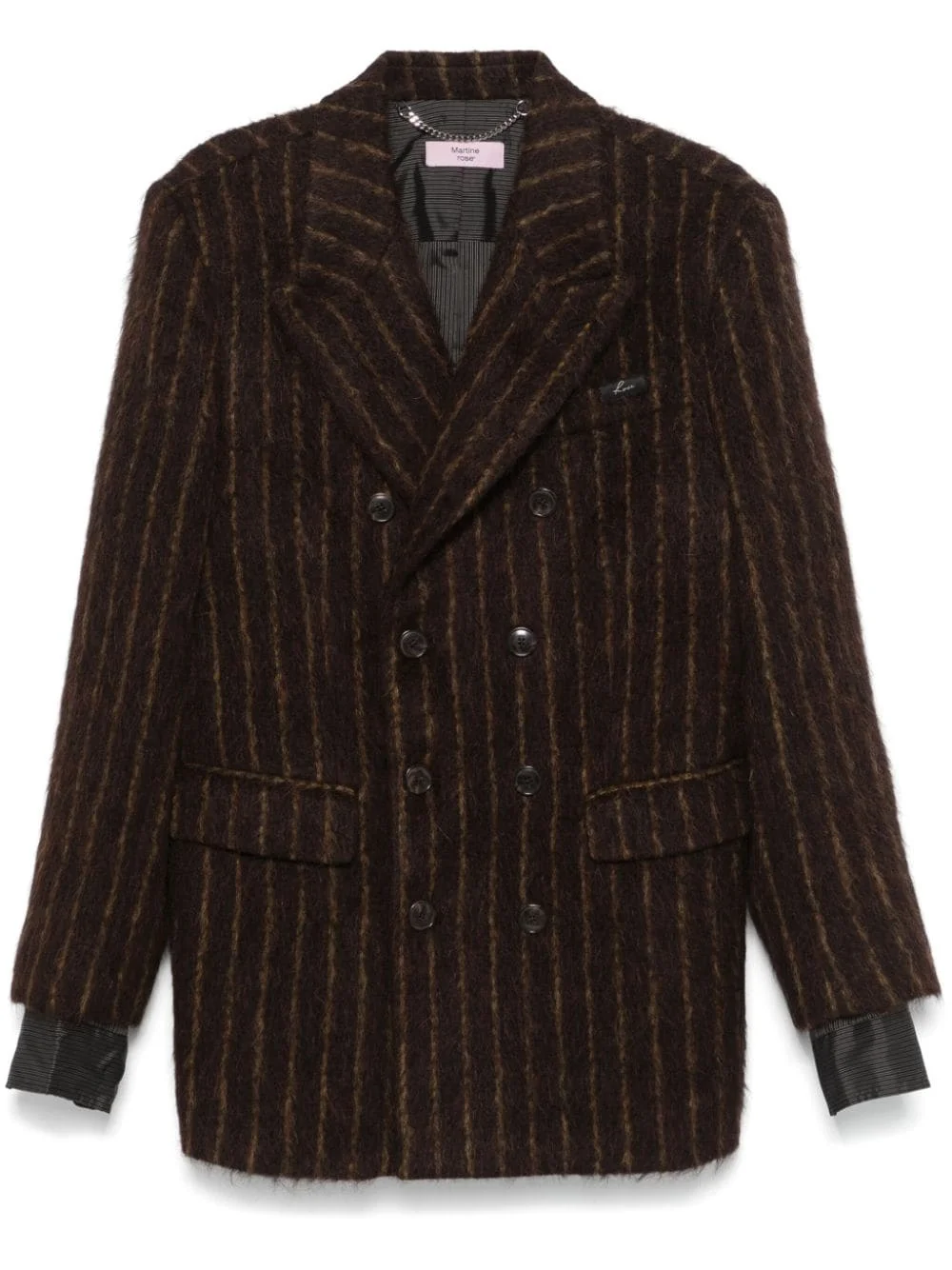 double-breasted blazer Highlights - Chocolate brown/caramel brown - Wool blend - Brushed effect - Pinstripe pattern - Double-breasted button fastening - Peak lapels - Shoulder pads - Long sleeves - Buttoned cuffs - Layered details - Chest welt pocket - Two front flap pockets - American rear vent - Internal jetted pocket - Striped lining - Straight hem - When buying this unisex item, keep in mind that it is graded in standard men's sizing. Made in Italy Composition Outer: Wool 50%, Polyamide 28%, Mohair 12%, Alpaca Wool 10% Lining: Acetate 50%, Cupro 50% SIZE & FIT Model measurements Height 5 ft 9 in(1.75 m) Bust/Chest 30.7 in(78 cm) Hips 36.22 in(92 cm) Waist 25.98 in(66 cm) FittingInformation This piece is unisex – if you usually select men's sizing expect a loose fit throughout; if you usually select women's sizes, expect an oversized fit The internal shoulder pads offer a structured shape Made from a midweight non-stretch fabric, this piece offers minimal elasticity when worn
