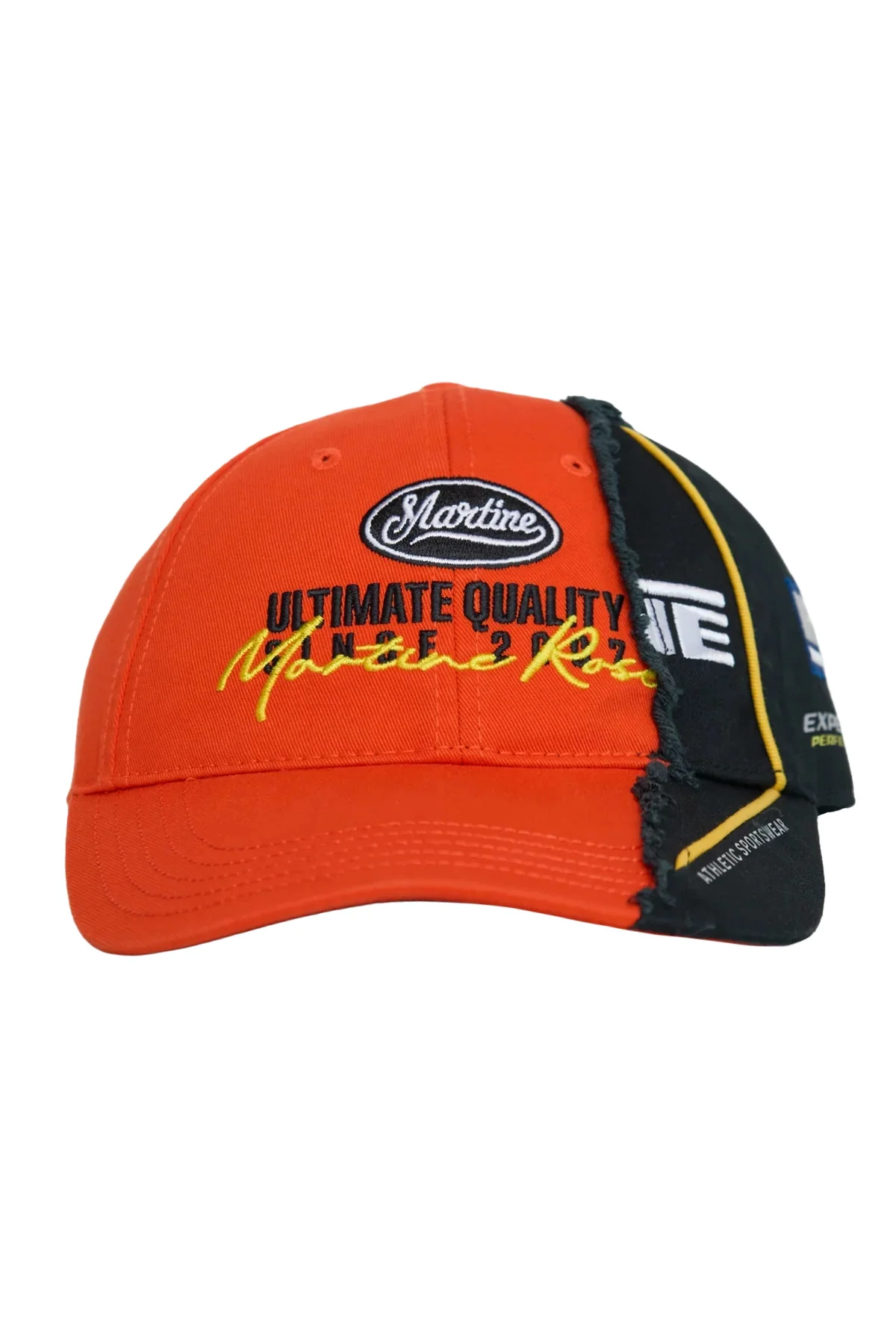 Martine Rose Collage Cap is a baseball cap in contrasting orange and black panels. Features an embroidered seasonal logo patch at the front, seasonal artwork embroidery at the side, piped detailing, and an adjustable back strap. DETAILS - Spot clean only - Back adjustable velcro strap - Front embroidered design - Side reflective slogan with patch detailing - Ventilating eyelets at top - Back embroidered logo - Brim measures approx 3" in length - OS measures approx 23" in circumference Material: Self: 100% cotton Lining: 100% polyester Made in China Product codes: - SKU: ESSX/MAR/AW25/1217WP13200/Multi/OS - UPC: 5059107644377