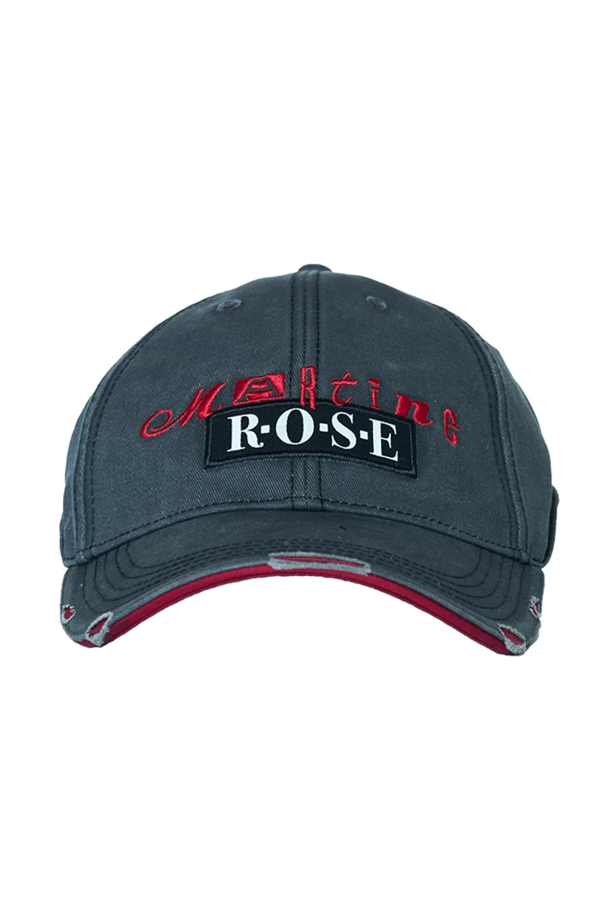 The Martine Rose Logo Roll Back Cap in faded cotton twill featuring a logo patch and embroidered logo at the face, distressed curved brim, rolled trim with printed text at the sides, and logo-embroidered velcro fastening at rear. DETAILS - Twill fabrication - Embroidered eyelets at crown - Logo at face - Distressing at curved brim - Rolled trim with text at sides - Logo-embroidered velcro fastening - Quilted browband - Partial twill lining Material: 100% Cotton Lining: 100% Polyester Made in China Product codes: - SKU: ESSX/MAR/SS25/1168WP13029/Gray/OS - UPC: 1403558036894