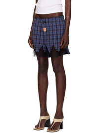 Cotton seersucker shorts. Check pattern and scalloped edges throughout. · Bow applique at elasticized waistband · Logo patch at button fly · Two-pocket styling · Lace trim at cuffs Part of the exclusive SSENSE HEAT capsule. Supplier color: Blue navy check Body: 100% cotton. Trim: 100% polyester. Made in Bulgaria 252892F088001