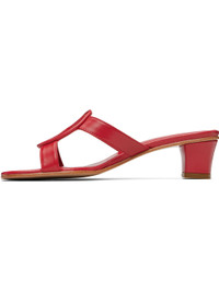 Buffed kidskin heeled sandals. · Open toe · Straps at vamp · Logo embossed at padded footbed · Covered heel with rubber injection · Smooth leather sole · Heel: H1.75" Supplier color: Red Upper: kidskin. Sole: leather, rubber. Made in Argentina 251778F125005