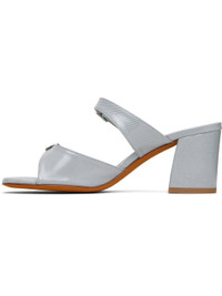 Coated denim heeled sandals. · Open square toe · Pin-buckle straps at vamp · Logo embossed at padded footbed · Covered block heel with rubber injection · Nubuck sole · Heel: H2.75" Supplier color: Ouran fabric Upper: textile. Sole: leather, rubber. Made in Italy 251779F125033