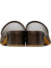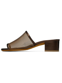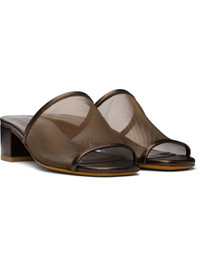 Sheer mesh and buffed leather heeled sandals in brown. · Open square toe · Logo embossed at padded leather footbed · Covered block heel with rubber injection · Nubuck sole · Heel: H1.5" Supplier color: Penny metallic Upper: textile, leather. Sole: leather, rubber. Made in Italy 251779F125007