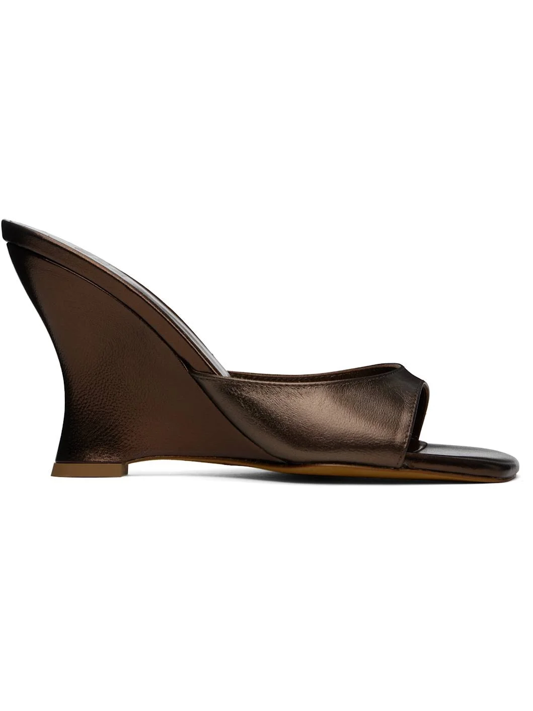 Grained calfskin heeled sandals in metallic-brown tone. · Open square toe · Logo embossed at padded footbed · Covered wedge heel with rubber injection · Nubuck sole · Heel: H3.5" Supplier color: Metallic brown Upper: calfskin. Sole: leather, rubber. Made in Italy 251779F125017