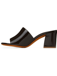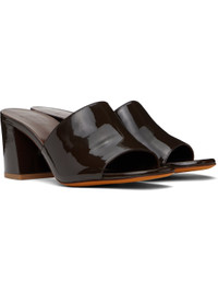 Patent calfskin heeled sandals in brown. · Open toe · Logo embossed at padded leather footbed · Covered block heel with rubber injection · Nubuck sole · Heel: H2.5" Supplier color: Carob Calfskin. Made in Italy 251779F125014