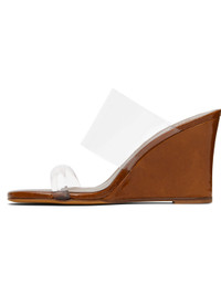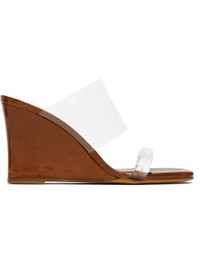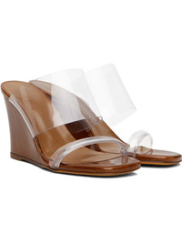 Transparent Perspex® heeled sandals. · Open square toe · Logo embossed at padded footbed · Patent goatskin wedge heel with rubber injection · Suede sole · Heel: H3.5" Supplier color: Sella patent Upper: rubber. Sole: leather, rubber. Made in Italy 251779F125035