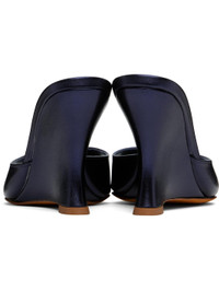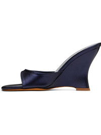 Grained calfskin heeled sandals in metallic-navy tone. · Open square toe · Logo embossed at padded footbed · Covered wedge heel with rubber injection · Nubuck sole · Heel: H3.5" Supplier color: Deep metallic blue Upper: calfskin. Sole: leather, rubber. Made in Italy 251779F125018