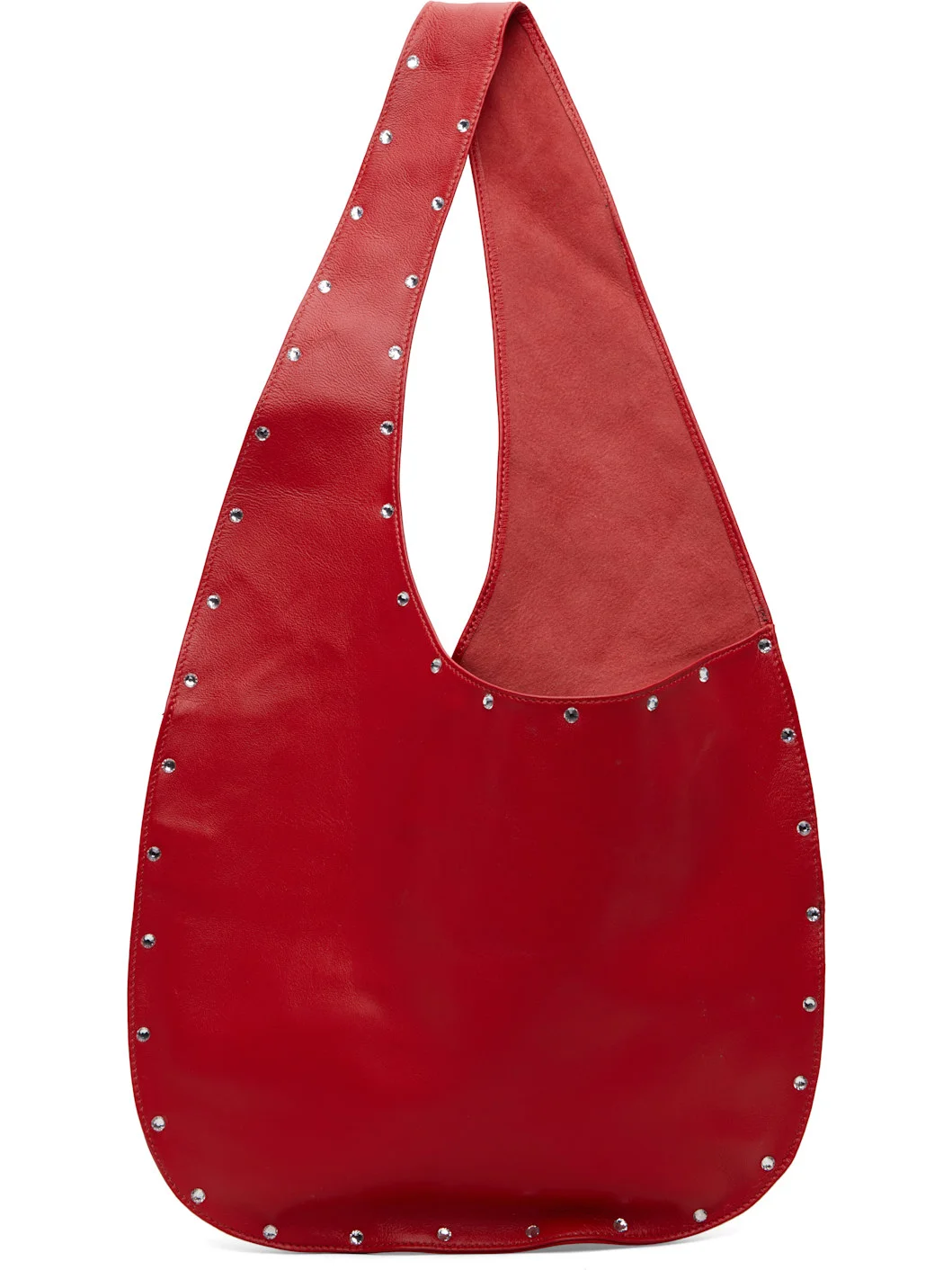 Buffed calfskin tote. · Fixed shoulder strap · Crystals at face and strap · Open throat · Suede lining · H10.25" x W13" Supplier color: Rouge Calfskin. Made in Italy 261779F049006