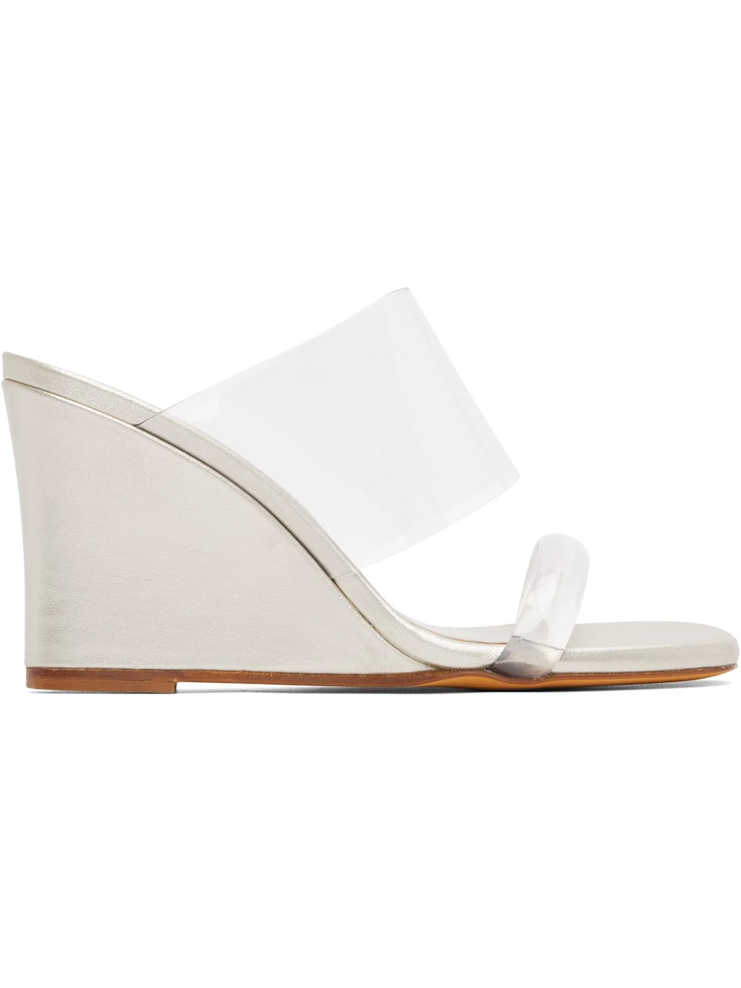 Transparent Perspex® heeled sandals. · Open square toe · Straps at vamp · Logo embossed at padded leather footbed · Laminated leather-covered wedge heel with rubber injection · Nubuck sole · Heel: H3.25" Supplier color: Lux calf Upper: rubber. Sole: leather, rubber. Made in Italy 261779F125006