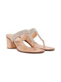 Grained leather slip-on heeled sandals in tan. · Thong-style strap at open almond toe · Crystal-cut detailing at vamp · Logo embossed at padded footbed · Covered block heel with rubber injection · Leather outsole · Heel: H2 in Supplier color: Bronze Upper: leather. Sole: rubber, leather. Made in Turkey 231779F125004