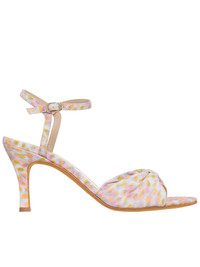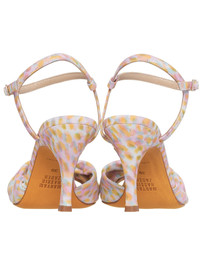Maryam Nassir Zadeh sandal in multicolor, cotton and poly blend strap, open toe and back, bow detailing on lower strap, rounded toebox, all over graphic print, ankle pin and buckle closure and leather strap construction, stiletto heel, leather outsole, tonal stitching. Made in Italy. European Sizing.