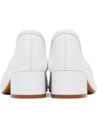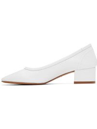 Buffed calfskin heels in white. · Almond toe · Logo embossed at padded footbed · Covered block heel with rubber injection · Leather sole · Heel: H1.5" Supplier color: White calf Upper: calfskin. Sole: leather, rubber. Made in Portugal 242779F122003
