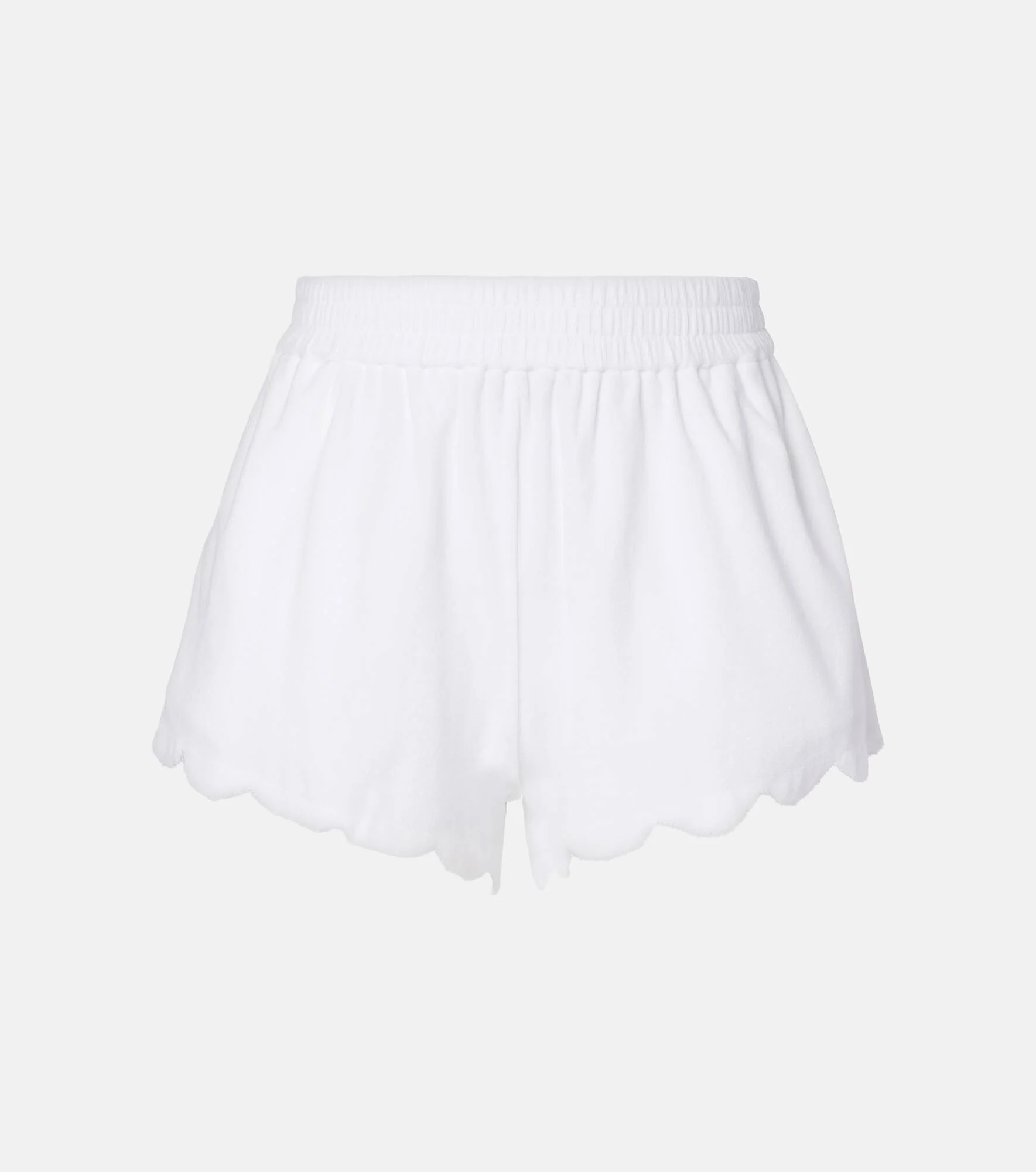 Marysia’s most recognizable feature is the hand-cut scalloped edges that do without stitching or elastic for a more flattering fit. They are prominently showcases here on the cotton-blend Bellini shorts. Product Details - Material: 66% cotton, 34% polyester - Care instructions: machine wash cold - Made in China - Color: white - Designer color name: Coconut - Item color: white - Interlining: 100% cotton - Elasticated waistband - Hem: scalloped - Item number: P01075491 Size & Fit - True to size - Elasticated waist - Stretchy fabric - Wide-leg - The model seen in the picture is 178cm-5'10" and wearing a size XS