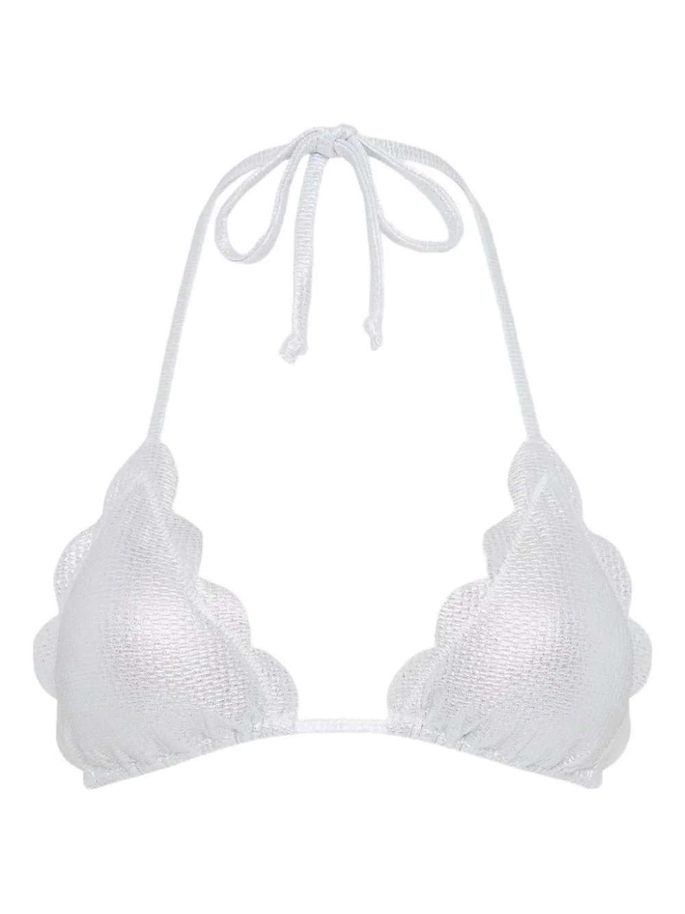 Broadway triangle bikini top Highlights - Silver - Scalloped edge - Triangle cups - Tie fastening Imported Composition Polyamide 88%, Elastane 12% Washing instructions Read Manufacturer Guidelines
