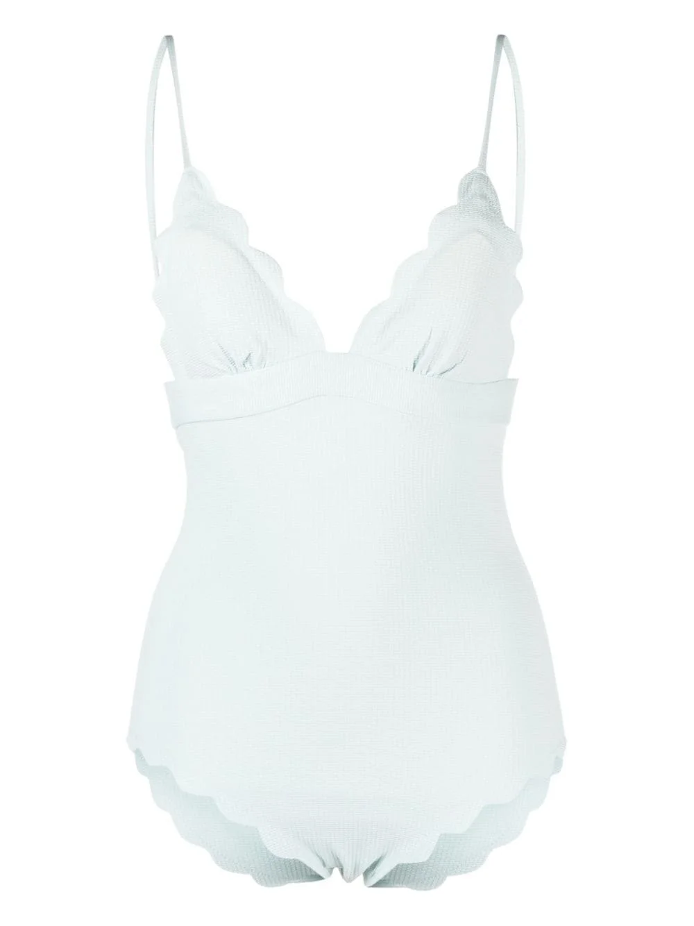 Santa Clara triangle swimsuit Highlights - Light blue - Stretch-design - Basket weave - Scallop edge - Triangle cup - Spaghetti straps - Rear tie fastening - Scoop back - One-piece design - Be mindful to try on swimwear over your own garments. Imported Composition Polyamide 88%, Spandex/Elastane 12% Washing instructions Hand Wash