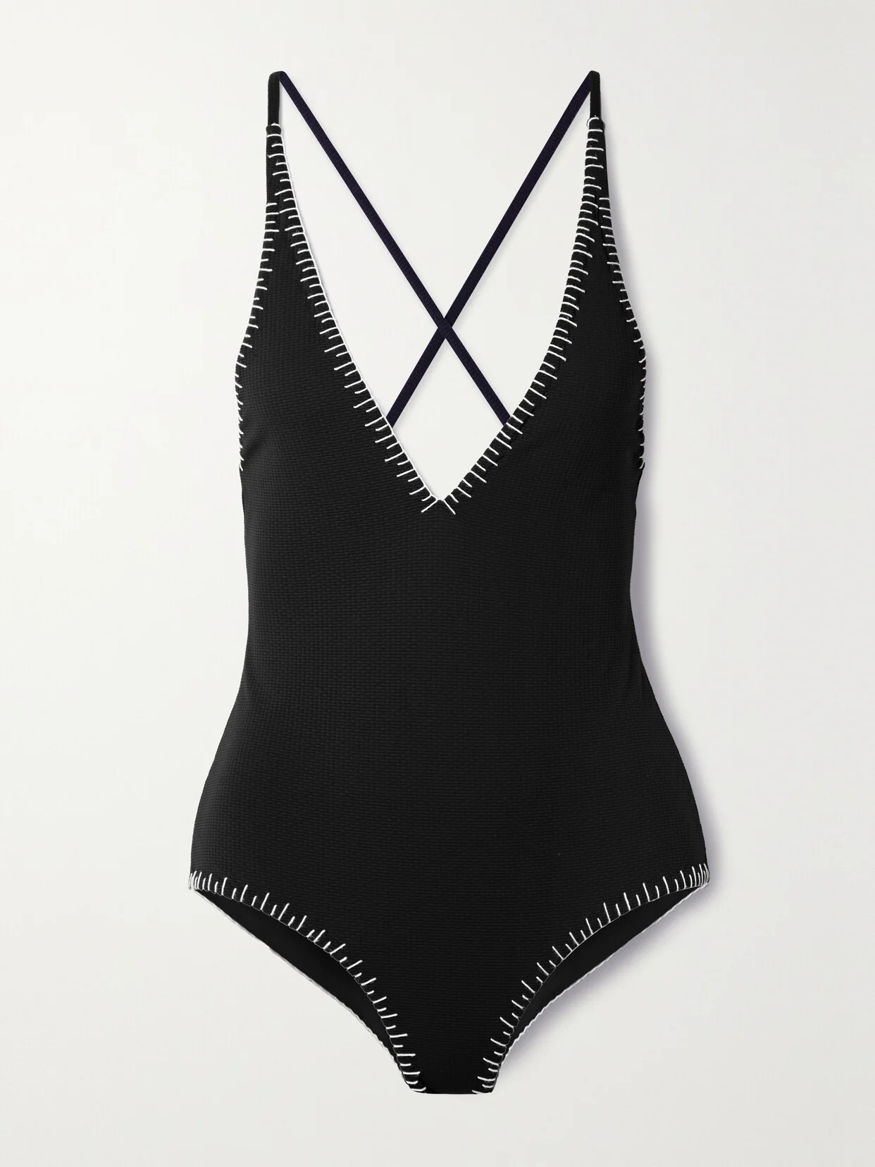 Marysia's 'Sole' swimsuit is a vacation space saver, since the pared-back design allows you to also wear it as a bodysuit on nights out. It's made from tactile seersucker that's outlined with hand-stitched white embroidery and has crisscross straps framing the low, scooped back.