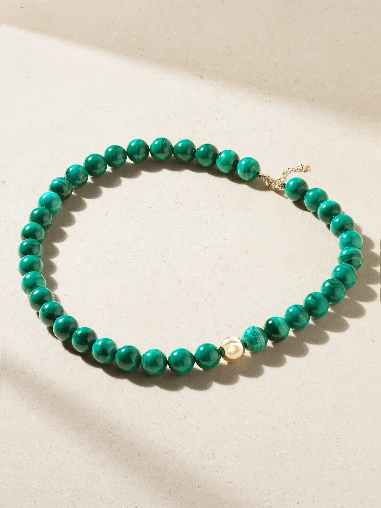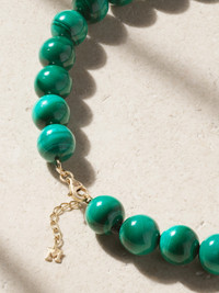 Mateo's jewelry is both modern and timeless, so you can feel good investing in pieces knowing you'll enjoy them now and for years to come. This necklace is hand-strung with a glossy malachite beads contrasted by a single 14-karat gold one. It makes a statement worn solo, or you can layer it with longer styles from the brand.