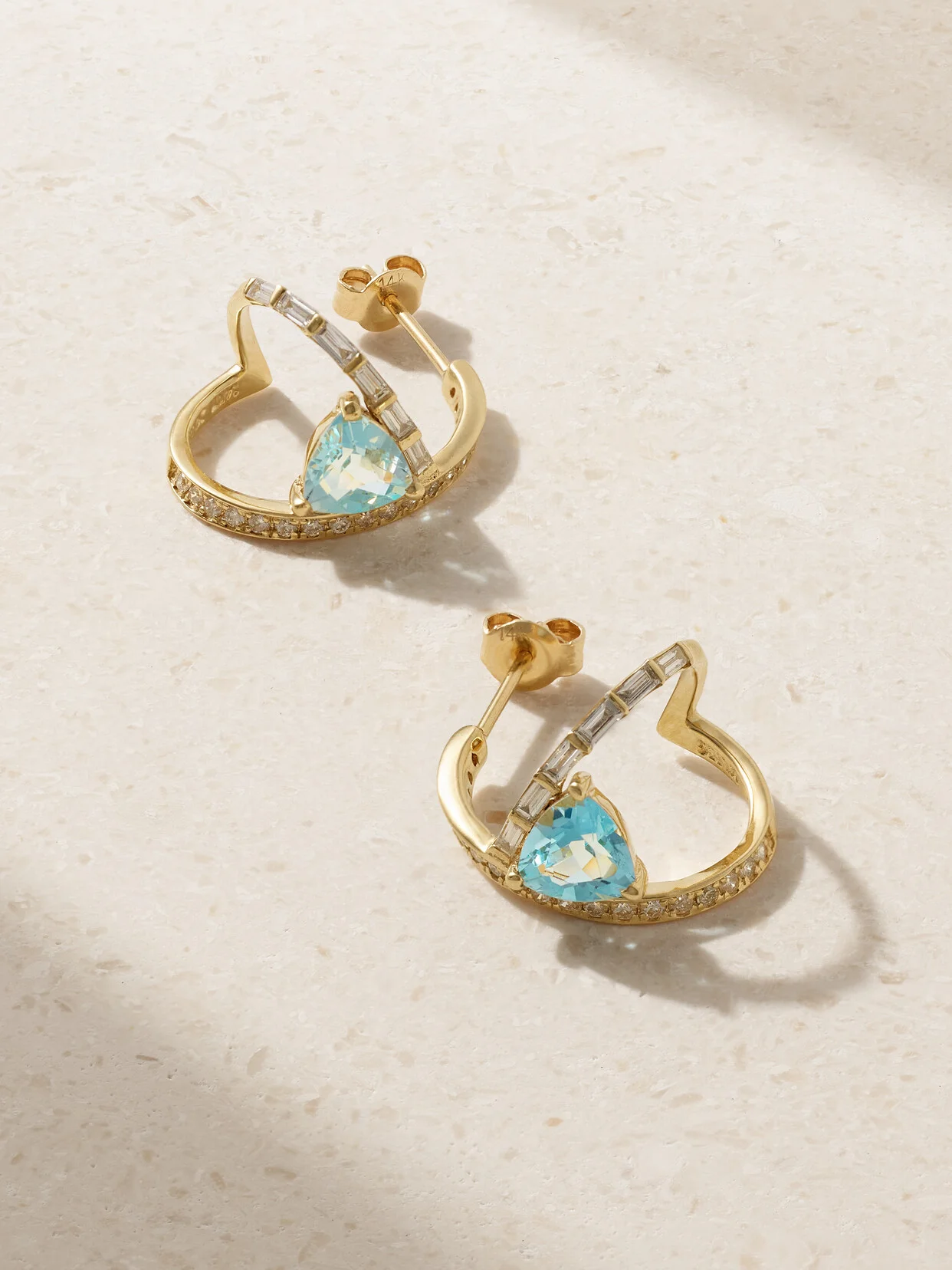 Mateo takes a pair of simple hoops and re-imagines them in a way that feels fresh and modern. Handmade in New York, this 14-karat gold 'Y'-shaped pair is set with round and baguette diamonds framing a special trillion-cut blue topaz.