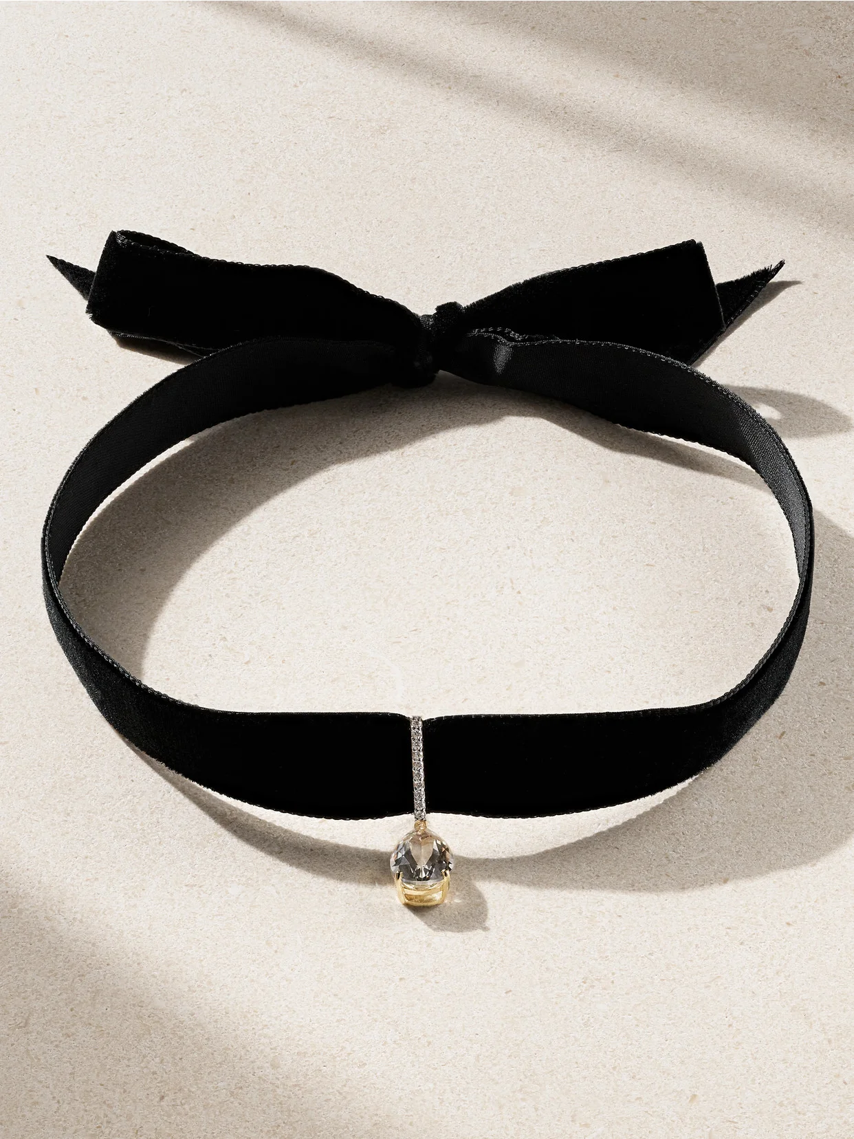Mateo's plush velvet choker is threaded with a dainty 14-karat gold pendant. A row of dainty diamonds spread across the width, while a pear-cut 8.14-carat white topaz dangles prettily underneath. Adjust yours to fit higher or lower on your neck.