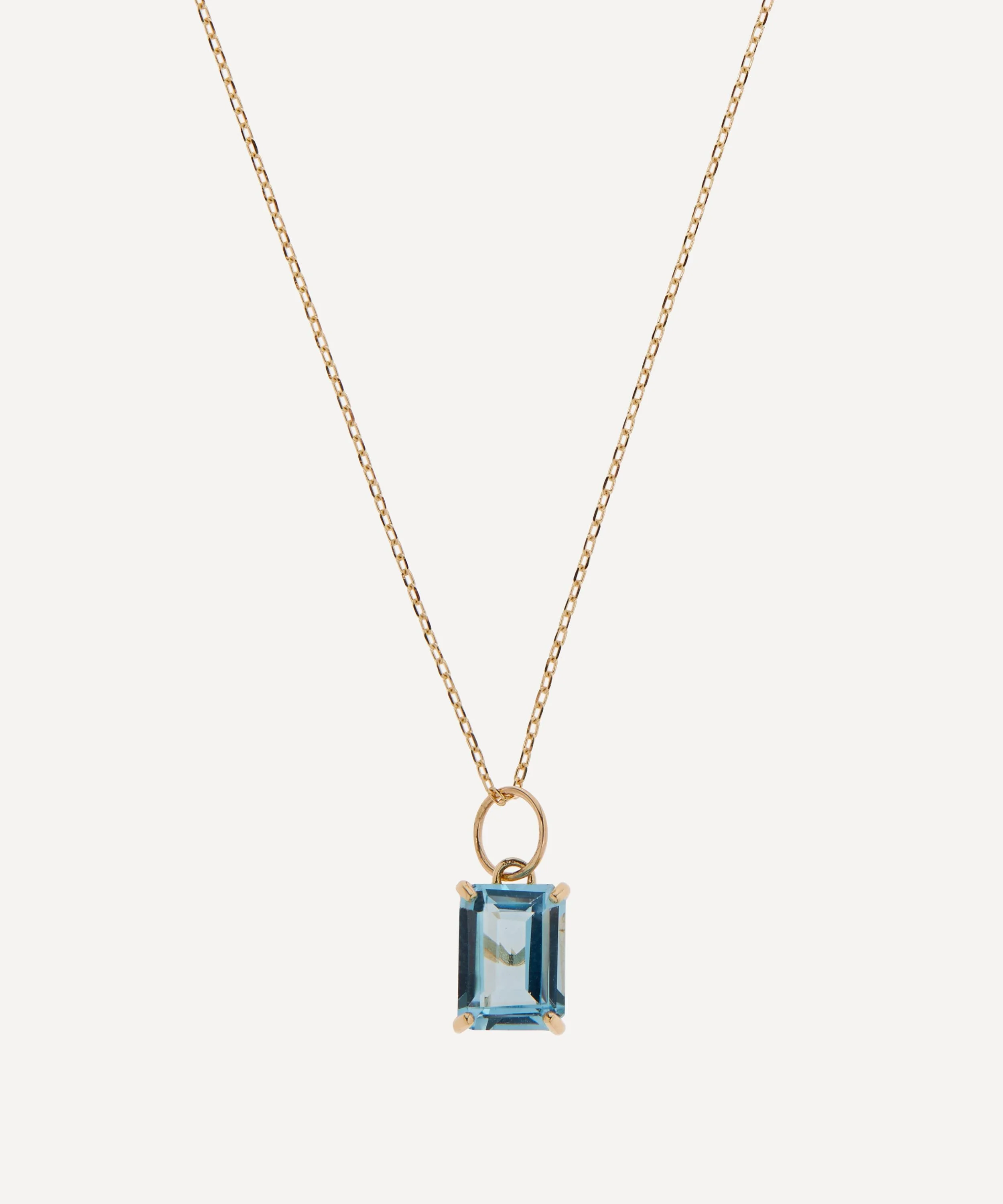 DETAILS Pendant necklace 14ct gold Emerald cut blue topaz pendant Fine link chain Lobster clasp fastening Made in New York COMPOSITION & SIZE 14ct Gold; Blue Topaz Chain L: 40.5cm (5cm extender)