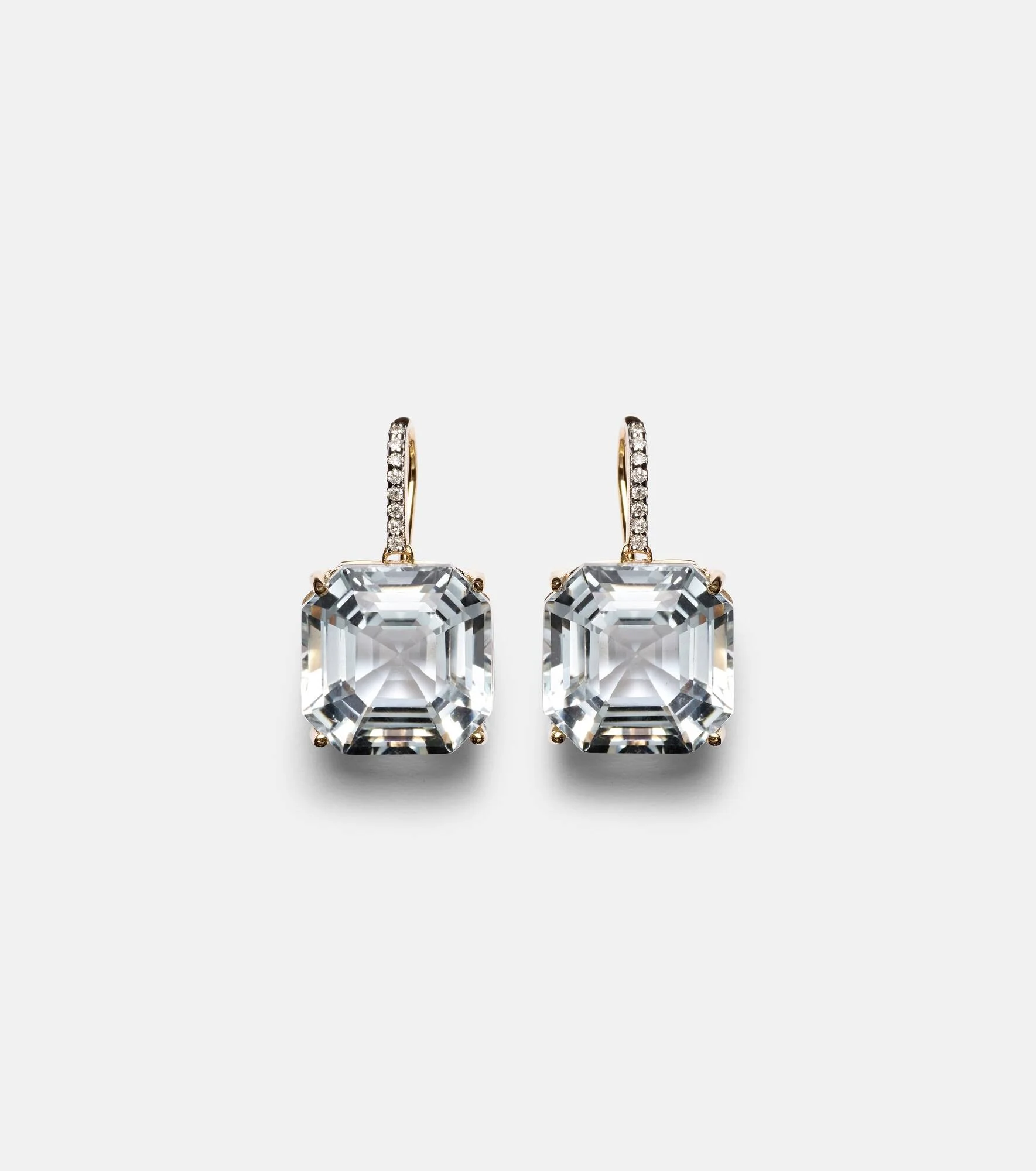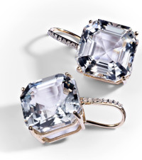 Product Details - Material: 14kt yellow gold - Made in the USA - Stone I: quartz, asscher-cut, prong setting - Stone II: diamond, round-cut, pavé setting - Stone I carat total weight (ctw): 16.60 - Stone II carat total weight (ctw): 0.064 - Item number: P00964300 Size & Fit - Length 22mm-0.85" - Max. width 11mm-0.45"