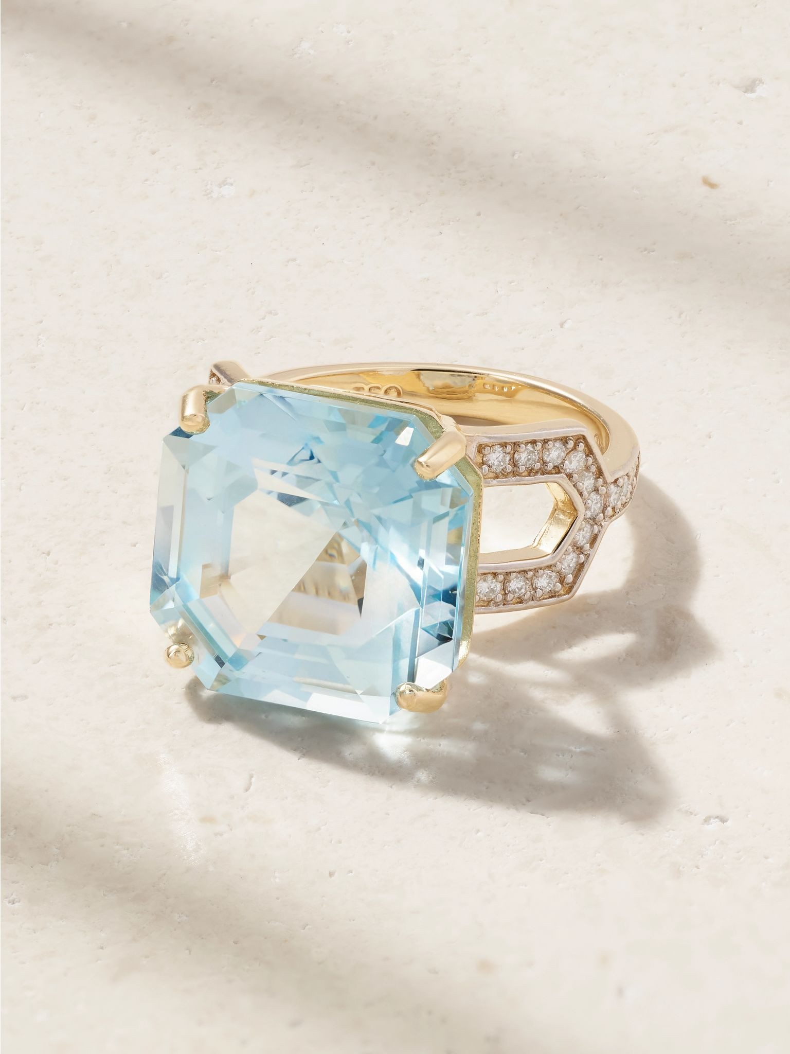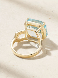 Mateo's ring is centered with a stunning 21.65-carat Asscher-cut topaz – one of the designer's favorite cuts thanks to its dazzling 'hall of mirrors' effect. It's been handmade in New York from 14-karat gold and inlaid with 0.25-carats of shimmering diamonds along the split shank. Size & Fit - US sizing - Measurements can be found in the link below Details & Care - Asscher-cut blue topaz, total weight: 21.65-carats; diamonds, total weight: 0.252-carats - This piece has been certified in accordance with the Hallmarking Act 1973
