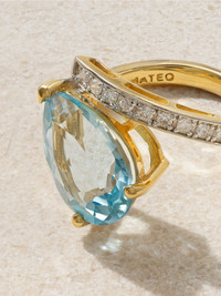 Mateo's ring is centered with a pear-cut Swiss Blue topaz that's placed at an angle for an elegant twist. It's crafted from 14-karat gold with diamonds in a white rhodium setting. Size & Fit - US sizing - Measurements can be found in the link below Details & Care - Pear-cut Swiss Blue topaz; diamonds, total weight: 0.27-carats - This piece has been certified in accordance with the Hallmarking Act 1973
